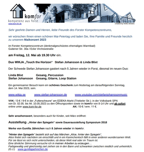 Duo WIKJA „Touch the Horizon“ Stefan Johansson & Linda Blixt sind am 12. Mai 2023 im Kompetenzzentrum zu Gast 26.04.2023 12:53 - Helmut Fleischhauer ![]() Für Freunde handgemachter Musik - Duo WIKJA „Touch the Horizon“ Stefan Johansson & Linda Blixt sind am 12. Mai 2023 im Kompetenzzentrum zu Gast. Nach fünf Jahren in seiner schwedischen Heimat stellte Ende 2022 Stefan Johansson sein neues Duo „Wikja“ und die erste gemeinsame CD „Touch the Horizon“ erstmals in Dresden vor. Linda Blixt hat maßgeblich bei der musikalischen Umsetzung des Werkes mitgewirkt und Text- sowie Musikideen kreiert. Mit ihrer warmen Altstimme und an den Percussions bereichert sie das Programm. „Wikja“ ist ein altes Wort für Wikinger und auch ein Begriff aus der Segelwelt, der die Distanz zwischen den Ruderbooten beschrieb. Das Duo präsentiert eigene Songs und schwedische Folksongs, die die Seele berühren. Mit Gesang, Gitarre, Percussion und Loopstation werden die Zuhörer auf eine musikalische Reise zum Horizont mitgenommen: Ruhe, räumliche Weite, das Erspüren von Freiräumen und Möglichkeiten. Zugleich Kraft und sprühende Energie. Der schwedische Musiker Stefan Johansson, Mitbegründer des Weltmusik-Trios Strömkarlen, ist seit fast 30 Jahren musikalisch auch solistisch unterwegs. Der Nordschwede hat bereits drei Soloalben mit eigenen Songs aufgenommen: „Finding home“ (2010), „The door to the unknown“ (2014) und „65° Nord“ (2017). Gemastert wurde das zweite Album in den durch die Beatles berühmt gewordenen abbey road studios in London. Das 2014-Album stellte er im Rahmen einer Fahrrad-Deutschlandtournee vor, mit der er Spendengelder in Höhe von über 6000 Euro für die Hilfsorganisation arche noVa „erradelte“. Jetzt an seiner Seite: Linda Blixt. Sie wurde im nordschwedischen Luleå geboren und hat bereits eine sportliche Karriere mit schwedischen Meisterschaftstiteln in drei Sportarten zu verzeichnen. Aber auch Musik hat ihr Leben geprägt: So tourte sie mit dem Chor „Bothniakören“ der Band „Bitchboys” und mit der A-Cappella-Band „Influenser” häufig in Nordschweden. Kein Wunder: Das Musikalische wurde ihr durch die Großeltern in die Wiege gelegt, die als Konzertpianist, Hofsänger beziehungsweise „Träller” tätig waren. Beim Tanzen war es eine Zeit lang verboten, Livemusik zu machen, aber es war erlaubt, eine „Trällerin” zu haben, die die Melodien quasi „geträllert” hat. Für „Wikja“ begann Linda Blixt, auch eigene Musik und Textideen zu entwickeln und umzusetzen. |
