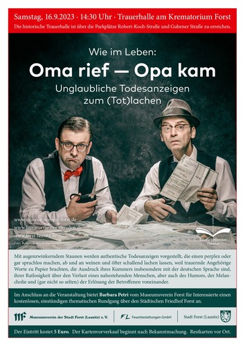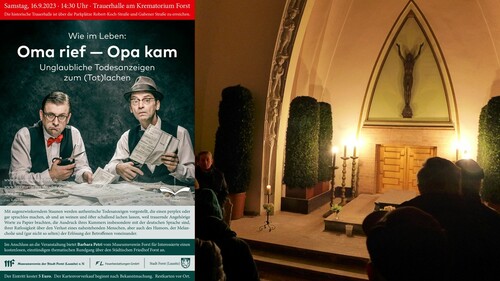 Literaturtheater im Krematorium -Todesanzeigen zum totlachen 03.09.2023 12:00 - Frank Henschel Noch 11 Einrittkarten gibt es bei der Touristinfo für das Literaturtheater am 16. September um 14.30 Uhr im Krematorium. Eintritt 5 Euro. |