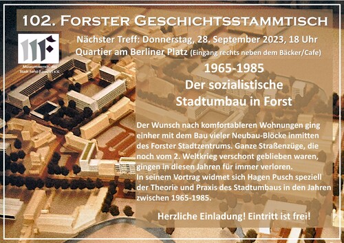 102. Forster Geschichtsstammtisch - Der sozialistische Stadtumbau in Forst zwischen 1965-1985 09.09.2023 19:00 - Frank Henschel Der Wunsch nach komfortableren Wohnungen ging einher mit dem Bau vieler Plattenbau-Blöcke inmitten des Forster Stadtzentrums. Straßenzüge in der Amt-, Cottbuser-, Mühlen-, Thum-, Gerberstraße usw., die noch vom 2. Weltkrieg verschont geblieben waren, gingen in diesen Jahren für immer verloren.In seinem Vortrag widmet sich Hagen Pusch speziell der Theorie und Praxis des Stadtumbaus in den Jahren zwischen 1965-1985. Die Veranstaltung findet am 28. September um 18 Uhr in Quartier am Berliner Platz statt. Der Eingang befindet sich rechts neben dem neuen „Bäcker-Cafe“. |