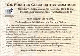Zu den Forster Schriftstellern des frühen 20. Jahrhundert wie Max Bittrich und Oswald Bergener muss man nun einen weiteren hinzuzählen. FELIX WAGNER, geboren 1875 in Forst-Berge, ging er als gelernter Tuchmacher in die Welt. Ein ansehnlicher Nachlass mit Erzählungen und Gedichten, die immer wieder in Forst, aber auch Triebel, Cottbus und Sorau spielen, konnte der Museumsverein sichern.