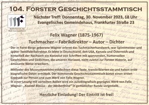 104. Forster Geschichtsstammtisch mit einer Neuentdeckung! 12.11.2023 23:00 - Frank Henschel Zu den Forster Schriftstellern des frühen 20. Jahrhundert wie Max Bittrich und Oswald Bergener muss man nun einen weiteren hinzuzählen. FELIX WAGNER, geboren 1875 in Forst-Berge, ging er als gelernter Tuchmacher in die Welt. Ein ansehnlicher Nachlass mit Erzählungen und Gedichten, die immer wieder in Forst, aber auch Triebel, Cottbus und Sorau spielen, konnte der Museumsverein sichern.Der kommende Geschichtsstammtisch führt in das Schriftgut und in die Biografie von Wagner ein. Sieben Mitglieder lesen dann in verteilten Rollen aus einem seiner Werke. Bei einem Glühwein kann man dann einer 1926 aufgeschriebenen Geschichte lauschen, die uns in das ausgehende 19. Jahrhundert zurückführt. |
