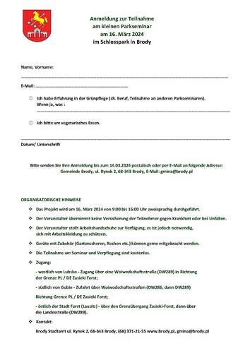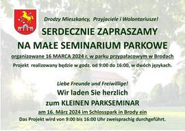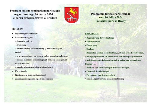 16. März -Kleines Parkseminar im Schlosspark Brody/Pförten 26.02.2024 20:05 - Frank Henschel ![]() Liebe Freunde und Freiwillige! Wir laden Sie herzlich zum KLEINEN PARKSEMINAR am 16. März 2024 im Schlosspark in Brody ein Das Projekt wird von 9:00 bis 16:00 Uhr zweisprachig durchgeführt. Weitere Infos und ANmeldung auf den Bildern. |