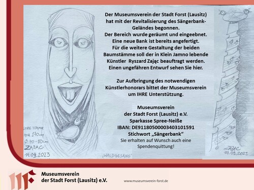 Keine Mittel aus dem Bürgerbudget für das Sängerbank-Gelände – Museumsverein hofft nun auf Unterstützung aus der Bürgerschaft! 04.04.2024 21:00 - Frank Henschel ![]() Im Frühjahr 2024 sollten weitere Arbeiten dem Gelände ein neues Gesicht geben. Für zwei der verbliebenen Baumstümpfe stellte der Künstler Ryszard Zajac aus Klein Jamno einen Entwurf vor. Das notwendige Honorar für die Ausführung beantragte ein Vereinsmitglied über das neue Bürgerbudget der Stadt Forst. Leider wurde der Antrag als nicht satzungskonform abgelehnt, obwohl das Areal im gut besuchten Naherholungsgebiet der Bürger und Gäste der Stadt Forst (Lausitz) liegt. So muss der Museumsverein einen anderen Weg suchen, um die notwendigen Finanzen für die Umgestaltung des gesamten Areals an der Sängerbank aufzubringen. Erste Spenden über die Veranstaltungen des Geschichtsstammtisches sind bereits eingegangen. Doch es klafft noch eine Lücke. Um diese zu schließen, bitten wir um IHRE Unterstützung. Museumsverein der Stadt Forst (Lausitz) e.V. Sparkasse Spree-Neiße IBAN: DE91180500003403101591 Stichwort „Sängerbank“ |