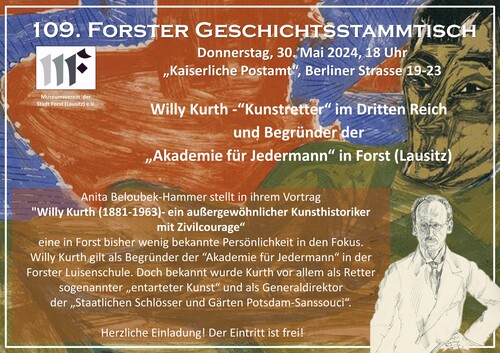 109. Forster Geschichtsstammtisch mit einer bisher unbekannten Geschichte 14.05.2024 12:00 - Frank Henschel ![]() Neben einer derzeit viel beachteten Rettung von 600 Kunstwerken, die im Dritten Reich nicht erwünscht war, hob Kurth auch das kulturelle Leben in Forst. Er gilt als Begründer der „Akademie für Jedermann“ in der Luisenschule aus der sich weitere Impulse in der Forster Kunstszene entwickelten. |