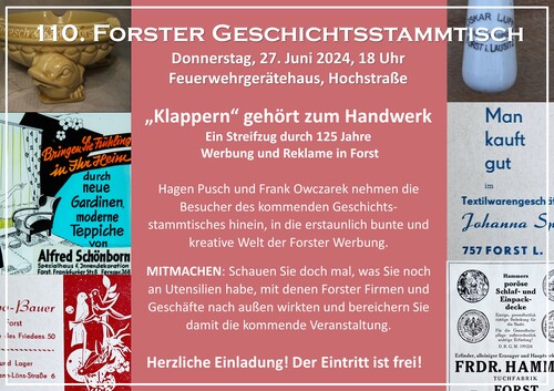 110. Forster Geschichtsstammtisch mit „Klappern“ gehört zum Handwerk - Ein Streifzug durch 125 Jahre Werbung und Reklame in Forst 11.06.2024 21:02 - Frank Henschel ![]() BITTE WEITERSAGEN |