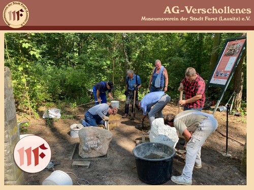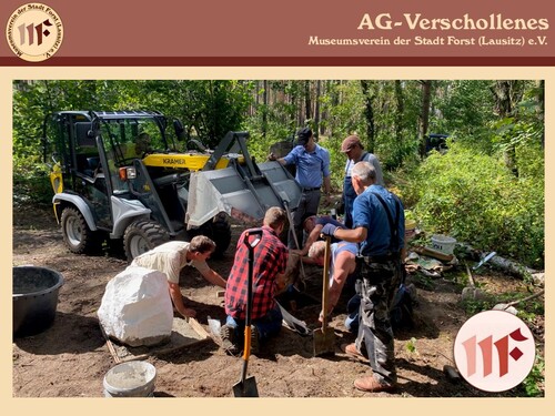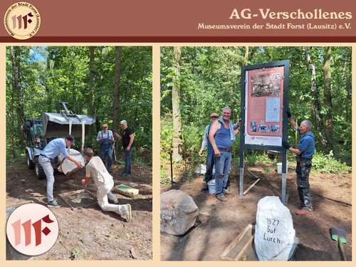 Nach dem Einbaum bei Naundorf, dem Eisenbahnunglück in Eulo und der Lohmühle, hob die „AG Verschollenes“ vom Museumsverein nun eine über hundert Jahre alte Geschichte des Forster Aquarianer-Vereins wieder ans Licht. Und diesmal kam auch das Hölzchen zum Stöckchen bzw. der Kiesel zum Steinchen. Denn den „Gut Lurch“-Stein, der einst die Besucher der Anlage mit Teichen, Terrarien und Becken begrüßte, rettete der inzwischen verstorbene Wolfgang Schenk. Er steht nun wieder im historischen Kontext. Von dem „Klobsch-Stein“ und der Eiche erfuhren wir aus dem Forster Jahrbuch und konnten diesen auch aus der nun verwilderten Anlage bergen. Beide Relikte stehen nun am alten Eingang des Vereins an der Malxe. Mehr zur Geschichte der Forster Aquarianer und dem Gelände findet man auf der Infotafel. Schaut doch mal vorbei. Teichstraße, hinter der Malxebrücke rechts und dann noch 200m. Danke an die Baufirma Förster für die wunderbare Unterstützung. UND FALLS noch jemand eine passende Bank hat oder aus Holzstämmen eine zimmern möchte, kann diese gern dazustellen.