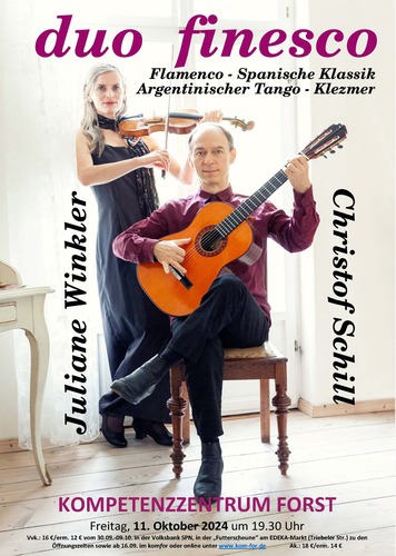 Traditionellen Herbstkonzert mit Vernissage ins Forster Kompetenzzentrum 11.09.2024 13:00 - komfor ![]() Im Forster Kompetenzzentrum (denkmalgeschütztes ehemaliges Warmbad) Gubener Str. 30a / Ecke Virchowstraße ein. am Freitag, 11.Oktober 2024 ab 19.30 Uhr. Flamenco mit dem „duo finesco" weltweit – rhythmisch – lyrisch Juliane Winkler - Violine, Akkordeon, Percussion Christof Schill – Flamencogitarre, Percussion www.juliane-winkler.com www.flamenco-christof-schill.de Vernissage „Würfelspiele“ Anlässlich seines 80. Geburtstages stellt Günther Rechn zum dritten Mal im komfor aus. Der Künstler wird am Abend anwesend sein. Erleben Sie die musikalische Vielfalt des Duos, mit Flamenco, spanischer Klassik, argentinischem Tango, Klezmer und Swing … Unvergesslich und abwechslungsreich sind ihre stilübergreifenden und verbindenden Arrangements, die sie mit Spielfreude und lustvollem Experimentieren präsentieren. Vvk.: 16 €/erm. 12 € vom 30.09.- 09.10. in der Volksbank SPN, in der „Futterscheune“ am EDEKA-Markt (Triebeler Str.) zu den Öffnungszeiten sowie ab 16.09. im komfor oder online unter www.kom-for.de Ak.: 18 €/erm. 14 € |