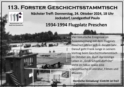 113. Geschichtsstammtisch zum Flugplatz Preschen 17.10.2024 20:00 - Museumsverein ![]() Auch das einstige Leben in „Groß Schacksdorf-Ost“ steht im Fokus sowie eine Spurensuche nach "Flugplatz-Artefakten" in Literatur, Filmen und Museen. Donnerstag: 24. Oktober 2024, 18 Uhr, Landgasthof Paulo in Jocksdorf |
