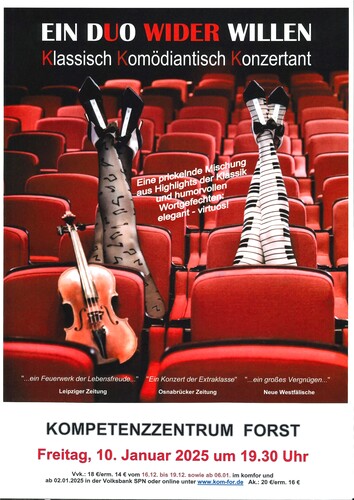 Einladung zum Heiteren Neujahrskonzert 10.01.2025 im komfor 17.12.2024 18:00 - komfor ![]() Dank einer perfekten Ausbildung an ihren Instrumenten und der überzeugenden komödiantischen Begabung entstand eine Liaison zwischen der ernsten Muse und dem unterhaltsamen Kabarett. Das Ergebnis dieser erstaunlich spritzigen Begegnung ist eine prickelnde Mischung aus Klassik und Entertainment – eben KLASSIKTAINMENT mit Isabell Engelmann (Klavier) & Sonja Godowska (Violine). www.les-troizettes.com s. Foto und Plakat Die Ausstellung „Würfelspiele“ Malerei Günther Rechn ist weiterhin zu sehen. Konzertkarten können ein schönes Weihnachtspräsent sein, deshalb VVK im komfor schon vom 16. bis 19.12.2024 8-14 Uhr und ab 06.01. bis 08.01.2025 sowie online www.kom-for.de 18 € erm.14 € (für Schüler/Stud., Arbeitslose, Schwb.), VVK auch wie immer in der Volksbank SPN in Forst und neu auch in Spremberg zu den Öffnungszeiten. AK 20 €/erm.16 €. |