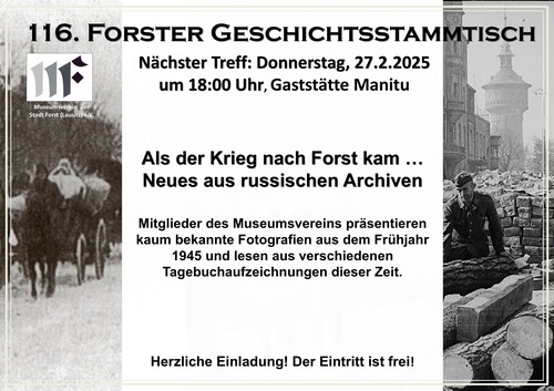 Als der Krieg nach Forst kam ... 116 Forster Geschichtsstammtisch 14.02.2025 20:00 - Museumsverein ![]() In den letzten Jahren sind aus verschiedenen russischen Archiven neue Fotos und Regimentstagebücher aufgetaucht, die uns nun einen erweiterten Blick auf die Forster Kriegstage im Frühjahr 1945 geben. Neben bekannten Zeitzeugnissen sollen diese in einem Vortrag mit präsentiert werden. |