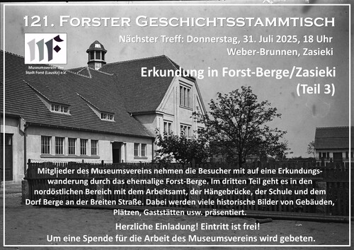 121. Forster Geschichtsstammtisch - Erkundungen in Forst-Berge (Teil 3) 15.07.2025 16:00 - Museumsverein ![]() Donnerstag, 31. Juli um 18 Uhr. Treff ist am Weberbrunnen in Zasieki. |