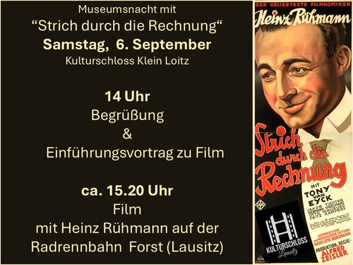 "Strich durch die Rechnung" wieder auf der Leinwand! 30.08.2025 11:00 - Frank Henschel ![]() Dieser UFA-Film spielt im Radsport Millieu und wurde zu großen Teilen auf der Radrennbahn in Forst Lausitz gedreht. Beginn 14 Uhr mit Berüßung und einem einführenden Vortrag zum Film. Gegen 15.20 Uhr radelt Rühmann wieder über die Radrennbahn. |