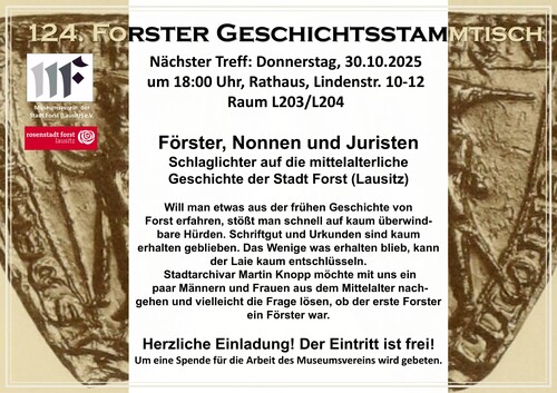 124. Forster Geschichtsstammtisch geht ins Forster Mittelalter 14.10.2025 20:00 - Museumsverein Will man etwas aus der frühen Geschichte von Forst erfahren, stößt man schnell auf kaum überwindbare Hürden. Schriftgut und Urkunden sind spärlich erhalten. Fünf große Stadtbrände haben vieles an Unterlagen vernichtet. Das Wenige was erhalten blieb, kann der Laie kaum entschlüsseln. Unter dem Titel „Förster, Nonnen und Juristen - Schlaglichter auf die mittelalterliche Geschichte der Stadt Forst (Lausitz)“ möchte Stadtarchivar Martin Knopp beim 124. Forster Geschichtsstammtisch einigen Männern und Frauen aus dem Mittelalter nachgehen und vielleicht die Frage lösen, ob der erste Forster ein Förster war.Donnerstag, 30. Oktober Rathaus, Lindenstr. 10-12 , Raum L203/L204. Der Eintritt ist frei. |