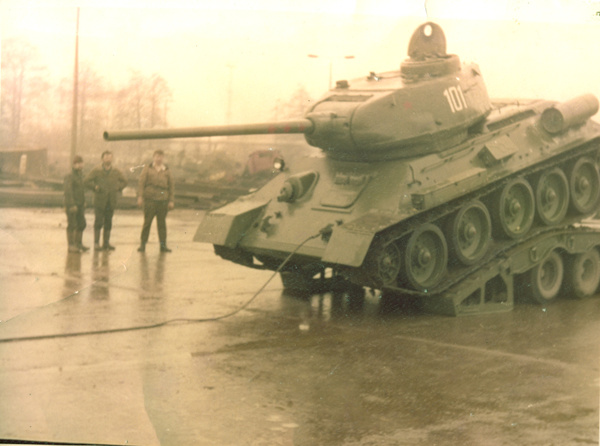 (1989) - Panzer vom Forster Panzerdenkmal wird auf dem Schrottplatz in Cottbus entladen