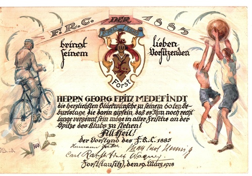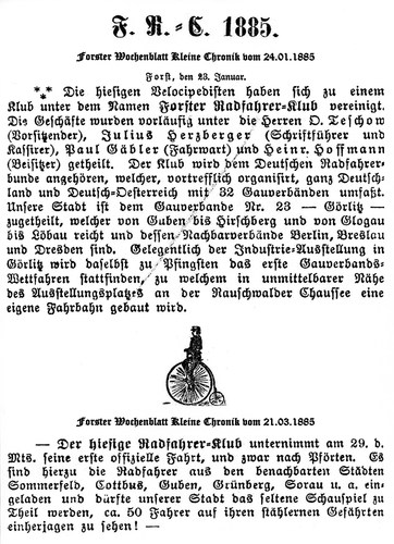 Lücke der Forster Radsportgeschichte soll geschlossen werden – Wer hat Informationen zum 1. Forster Radfahrer Club 1885? 12.03.2019 21:00 - Frank Henschel ![]() Aktuell ist eine Dokumentation der Vereine für das Forster Jahrbuch geplant. Dazu soll mit Hilfe der „Verschollenen“ Rubrik eine größere Lücke der Forster Radsportgeschichte geschlossen werden. Dabei geht es um den vor 134 Jahren gegründeten 1. Forster Radfahrer Club 1885 (FRC). Leider gibt es bis auf den Zeitungsartikel nur wenige Informationen zu diesem Verein. Gesucht werden Fotos und Dokumente von und über den 1. Forster Radfahrer Club 1885 (FRC). Um hilfreiche Informationen bittet Lutz Nerlich Tel.: 03562 660764 email: luvofo@kabel-net.de |