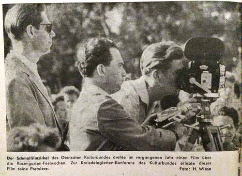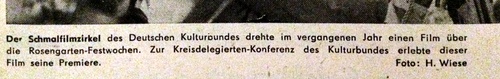 Über einen unbekannten und verschollenen Rosengarten-Film 28.01.2015 21:15 - Frank Henschel ![]() Vielleicht wäre das auch so bei dem verschollenen Rosengarten-Film, der die Rosengarten-Festwochen 1960 dokumentieren soll. Leider ist über den Verbleib des wohl semiprofessionell aufgenommenen Schmal-Films nichts bekannt. Erste Recherchen im Forster Stadtarchiv und in der Medienstelle des Landkreises Spree-Neiße liefen ins Leere. Dass es überhaupt so ein Werk gibt, ist eher zufällig ans Licht gekommen. In einer alten Ausgabe des monatlich erschienenen „Wegweiser- durch das kulturelle Leben des Kreises Forst (Lausitz)“ vom August 1961 gibt eine Bildunterschrift (siehe Bild) einen ersten Anhaltspunkt über diesen Film. Daraus ergeben sich nun nachfolgende Fragen: Wer kennt diesen Film? Wo ist dieser Film noch vorhanden? Wer sind die Personen auf dem Bild? Erkennt sich jemand? Gibt es noch ehemalige Mitglieder des Schmalfilmzirkels beim Kulturbund? Wo befindet sich der Nachlass des örtlichen Kulturbundes, vor allem der des Schmalfilmzirkels? Informationen zum verschollenen Rosengarten-Film erbittet das Stadtarchiv Forst Dr. Jan Klußmann Tel.: 03562 989-114 email: j.klussmann@forst-lausitz.de Bildquelle: „Wegweiser- durch das kulturelle Leben des Kreises Forst (Lausitz)“ vom August 1961 |