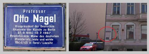 Für Professor Nagel waren zwei Schilder angebracht. Eins am Haus Otto-Nagel-Straße 2a. Ein Weiteres am Haus Otto-Nagel-Straße 34. Beide Häuser sind 2004 bzw. 2007 abgerissen worden.![]() |