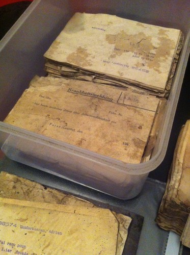 Rund 1300 Namen von Mitarbeitern der Deutschen Sprengchemie in Scheuno gesichert – ein riesiger Aktenfund! 28.03.2015 21:30 - Frank Henschel ![]() In ganz vielfältiger Weise ist diese Anlage heute Zentrum regionaler Forschung und Heimatkunde. Erinnert sei hier an die 1996 und 1998 beim uk-Verlag erschienenen Hefte „Das verbotenen Werk im Bunkerwald“ Teil I und II oder an die aktuelle Auswertung von Postkarten französischer Fremdarbeiter, die im Januar 2015 am Forster Gymnasium vorgestellt wurde. Vom hohen Interesse an dem Werk zeugen auch die vielen Anfragen nach Führungen beim Verein „Land & Leute - Region Lausitzer Neiße e.V.“ Wie nun erst bekannt wurde, bekam der Experte und Gästeführer für die Sprengchemie, Eberhard Detert, vor 10 Jahren ein riesiges Konvolut von Papieren zum Werk angeboten. Ein Pole hatte sie über die Jahre aus der Hauptverwaltung und anderen Gebäuden der Sprengchemie geborgen. Detert vermittelte diesen Fund an den Forster Heimatsammler Frank Owczarek. Ihm gelang letztlich der Ankauf der Papiere und die Überführung in seine Forster-Privatsammlung. Die gesamte Papiermenge füllte einen PKW bis unter das Dach aus. Darunter befanden sich Stempelkarten, Lohnlisten, Kalkulationen, Frachtbriefe, Rechnungen, Baufortschrittsberichte u.v.m.. In mühevoller Arbeit begann Owczarek nun die Papiere zu reinigen und auszuwerten. Schwerpunkt waren bisher vor allem die Stempelkarten. So konnten allein aus diesen Papieren schon rund 1300 Beschäftigte in Scheuno identifiziert werden. Doch noch sind viele Papiere ungesichtet sowie ungereinigt und harren der weiteren Auswertung. Die neusten Erkenntnisse zum Werk der Deutschen Sprengchemie in Scheuno werden im kommenden Forster Jahrbuch nachzulesen sein. Dies erscheint im November 2015. Anfragen zu den Belegschaftlisten sowie weitere Hinweise und Material zur Deutschen Sprengchemie können gerichtet werden an: Frank Owczarek mobil: 0151 44312972 email: frankow01@aol.com Anfragen zu Führungen durch den “Bunkerwald” richten Sie an: „Land & Leute“ Region Lausitzer Neiße e.V. Preschner Weg 5 . 03149 Forst Telefon: (0 35 62) 66 38 71 email: verein_land_und_leute@yahoo.de Alle Fotos: Frank Owczarek Extrabild im Großformat - Hier klicken |