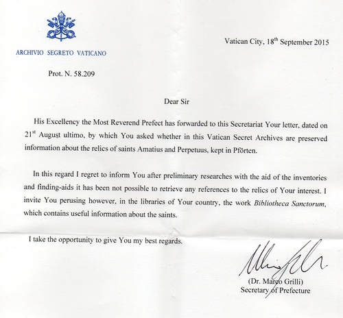 Zum Stand der Reliquien-Forschung in Pförten/Brody. 09.10.2015 23:00 - Frank Henschel ![]() Aus Rom kam dazu leider recht wenig Hilfreiches. Siehe der Brief vom 18.09.2015. Wertvoller war dagegen eine E-Mail von Dr. Winfried Töpler aus dem Bistumsarchiv in Görlitz. Er bestätigt ebenfalls, dass es sich bei den Heiligen „Amatii“ und „Perpetui“ um Männer handelt. Das „i“ am Ende der Namen ist die maskuline Genitiv-Endung. Desweiteren geht Dr. Töpler davon aus, dass es sich um unbekannte „Katakombenheilige“ also um Reliquien (z.B. Knochen) die man aus den Katakomben von Rom geborgen hat, handelt. Diese unbekannten christlichen Märtyrer in den Katakomben von Rom gelten eo ipso (durch sich selbst) als Heilige. Hilfreich Hinweise in dieser Sache erbittet weiterhin: Frank Henschel mobil 0172 -3759660 f.henschel@gmx.de |
