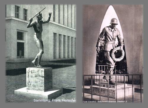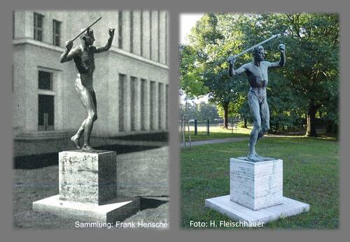 Der Soldat musste ins Feld, der Spieler konnte bleiben – über das Schicksal der beiden Wrba-Skulpturen. 13.02.2016 22:00 - Frank Henschel ![]() Die restlichen gingen in der Kriegs- und Nachkriegszeit verloren. Der „trauernde Soldat“ schuf Hans Wrba. Den Schlagballspieler schuf der wesentlich bekanntere Vater, der Dresdener Bildhauer Georg Wrba (1872-1939). Der Soldat bildete das Zentrum der Gedenkstätte für die Gefallenen des 1. Weltkriegs auf dem Friedhof am Krankenhaus. Er stand im Oktogon, dass 1930 dort gebaut wurde. Der Schlagballspieler dürfte etwas älter sein (1928) und gilt als „Kunst am Bau“. Der ursprüngliche Standort war nicht der heutige am Wasserturm sondern am Gymnasium in der Jahnstraße. (siehe Bild). Das unterschiedliche Schicksal der beiden Figuren wird in einem Leserbrief der Lausitzer Rundschau vom 7.2.2004 anschaulich beschrieben. Heidi Konjen berichtet dort: „Mein Opa, Stukkateurmeister Erich Feiertag, betrieb in der Forster Ziegelstraße seine Betonstein- und Terrazzo-Firma. Von der Stadtverwaltung bekam er in den Jahren des Zweiten Weltkrieges den Auftrag einen Gipsabdruck des Soldaten vom Oktagon des Forster Hauptfriedhofes zu fertigen. Danach wurde dieses Denkmal eingeschmolzen. Kurze Zeit später brachte man ihm den Schlagballspieler. Auch von diesem Denkmal wurde ein Gipsabdruck angefertigt, es sollte danach ebenfalls eingeschmolzen werden. Aber es kam anders. Durch die Kriegswirren holte niemand mehr den Schlagballspieler ab, und er verblieb in der Werkstatt. Mein Opa stellte den Schlagballspieler, in Strohbündeln verpackt, in die hinterste Ecke seines Materialschuppens. So „überlebte“ der Schlagballspieler unbeschädigt den Beschuss von Forst und unentdeckt das Kriegsende. Nach dem Krieg blieb die Figur noch einige Zeit im Versteck. Ich ging als kleines Mädchen immer wieder mal nachschauen, ob der "schwarze Mann“ noch im Schuppen steht. … In der Nachkriegszeit wurde der Schlagballspieler dann abtransportiert und am jetzigen Standort vor dem Stadion am Wasserturm aufgestellt.“ Auch wenn Wrbas Schlagballspieler noch keine hundert Jahre unsere Stadt schmückt gibt es viele gute Gründe ihn Wert zu schätzen und zu schützen. Frank Henschel f.henschel@gmx.de geändert am 07.08.2020 |