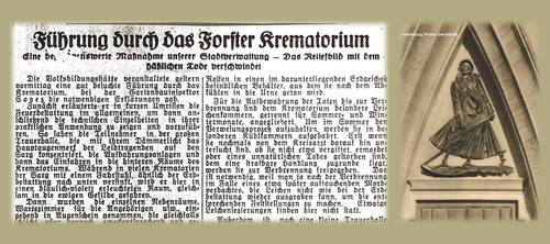 „Eine bemerkenswerte Maßnahme unserer Stadtverwaltung – Das Reliefbild mit dem häßlichen Tode verschwindet“ 23.02.2016 22:45 - Frank Henschel ![]() Zuvor hatte schon ein unbekannter Autor im Forster Tageblatt vom 28. August 1941 verschiedene Forster Skulpturen künstlerisch herabgewürdigt oder stark kritisiert. Besonders negativ im Fokus stand das Todesrelief am Krematorium aber auch das „Zahnwehmännlein“ am Rathaus in der Promenade, der früheren Ortskrankenkasse. Hier noch ein Zitat aus diesem Beitrag: „ … Blickt man nämlich vom Ehrenmal (Oktogon) aus über die herrliche Grünfläche und durch die schmucke Baumallee auf das Krematorium, das in seiner gesamten architektonischen Struktur äußerst stillvoll wirkt, so wird man geradezu in seinem tiefsten Innern durch das häßliche Reliefbild des Todes über dem Eingangstor verletzt. Eine solche mehr als abschreckende Schöpfung ist hier keinesfalls am Platze. Sie verschandelt geradezu das Gesamtbild … Dieses Reliefbild ist reif möglichst umgehend dem Schrotthaufen überliefert zu werden. … Dieses häßlichste aller Forster Denkmäler ist mehr als zeitüberlebt.“ Auf diesem Hintergrund scheint eine weitere Suche nach dem verschollenen Bronzerelief „Schnitter Tod“ von Georg Wrba aussichtslos. Das Relief hat nur 12 Jahre existiert. Bitte beachten Sie dazu auch den vorherigen Artikel vom 30.November 2015 hier auf der „Verschollenen-Seite“. Herzlichen Dank an Frau Barbara Petri von der Forster Friedhofsverwaltung, die mit ihren Hinweisen auf die historischen Zeitungsartikel maßgeblich zur Aufklärung beigetragen hat. Frank Henschel f.henschel@gmx.de Extrabild im Großformat - Hier klicken |