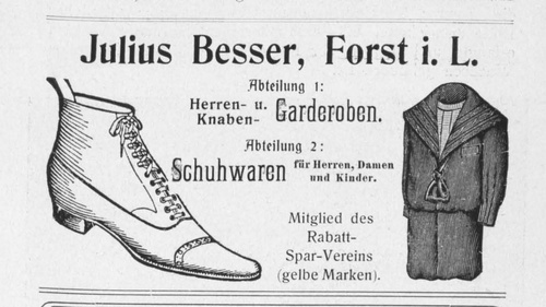 Geschäft Julius Besser - Gelöst 08.06.2016 06:44 - Helmut Fleischhauer ![]() Sie schrieb mir dann eine Email: "Julius Besser war der zweite Mann meiner Uroma Elise Besser. Mein Bruder schreibt in Brasilien ein Buch über unsere deutsche Familie und uns fehlt dieses kleinen Detail. Wissen sie was für ein Geschäft es war ? Vielen Dank, schöne Grüße, Cristina Heilborn-Guenther P.S.: Wenn sie Interesse haben, können Sie über Elise Besser, meine Uroma, auf der Homepage der Stolperstein Initiative Charlottenburg lesen. Es gibt auch ein paar Zeilen über Alexander Besser, der Sohn von Julius Besser." Antwort von Frank Henschel: "Es war ein Bekleidungs/Schuhgeschäft. Julius Besser starb Ende der zwanziger Jahre in Berlin. Hier lebte er etwa seit 1925 mit seiner zweiten Ehefrau. Sie wurde als Jüdin ermordet und ein Stolperstein erinnert an sie. Das Forster Geschäft wurde nach Infos auf Postkarten unter dem Namen Louis Harris weitergeführt. Im Büchlein "Zur Geschichte der Juden in Forst" kann man zu Julius Besser nichts finden." Foto: Sammlung Frank Henschel |