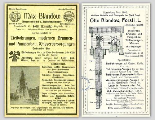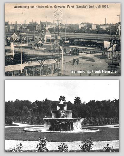 Eine Forster Entdeckung im Freilandmuseum Lehde 11.07.2016 21:00 - Frank Henschel ![]() Die Firma Blandow taucht 1906/1907 unter dem Namen Max Blandow in Anzeigen und auf der Ausstellung für Handwerk und Gewerbe auf. Spätestens seit 1921 wird sie unter dem Namen Otto Blandow im Adressbuch und in Anzeigen in der Frankfurter Straße 45 geführt. Das die Firma Blandow für mehr als nur einfache Schwengelpumpen prädestiniert war, zeigt der höchst aufwendig gestaltete Pavillon der Firma auf Ausstellung für Handwerk und Gewerbe 1906 auf dem Platz hinter dem Feldschlösschen (heute Aldi /Charlottenstraße). Für wenige Wochen installierte die Firma eine riesige Pumpenanlage mit Windrad und Springbrunnen. Die wenigen Abbildungen von dieser Ausstellung zeigen, wie prägend die Firma Blandow mit diesen Aufbauten das Ausstellungsgelände beeinflusste. Noch komplexer wie diese temporäre Anlage dürfte der Aufbau des historischen Kaskadenbrunnen im Forster Rosengarten gewesen sein. Die Firma Blandow fertigte ihn nach Entwürfen des Forster Bildhauers Johannes Neumann bzw. war sie maßgeblich daran beteiligt. Für den schönen Nachweis dieses Stücks Forster Handwerksgeschichte in Lehde sei Gerd Laeser (Lübbenau) hiermit herzlich gedankt. Frank Henschel f.henschel@gmx.de Extrabild im Großformat - Hier klicken |