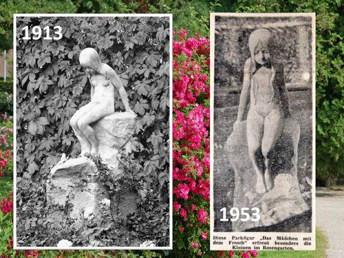 Der Sockel bleibt weiter leer. Letztes Foto vom „Mädchen mit dem Frosch“ stammt aus dem Jahr 1971 21.07.2016 21:30 - Frank Henschel ERGÄNZUNG ZU DEN ARTIKELN VOM 30.07.2015 UND 02.01.2015Bisher konnte keine „heiße Spur“ zum Verbleib der Figur „Das Mädchen mit dem Frosch“ von der Forster Wehrinsel aufgenommen werden. Dennoch gibt es neue Erkenntnisse, die sich aus Recherchen des Rosengarten-Manager Stefan Palm und einem Foto aus der Sammlung von Frank Owczarek ergeben. Nach neusten Erkenntnissen gehört die verschollene Figur zu Skulpturen aus der Anfangszeit des Forster Rosengartens. Sie wäre damit heute über hundert Jahre alt. Geschaffen wurde sie vom Cottbuser Bildhauer Walter Adler, der u.a. auch den bekannten Bärchenbrunnen schuf. Die verschollene Mädchenfigur wird über die Jahrzehnte recht unterschiedlich betitelt. Während sie anfänglich unter der Bezeichnung „Wassernixe“ und „Nymphe“ bekannt war tauchte später der Name “Das Mädchen mit dem Frosch“ auf. Übrigens sitzt der Frosch zu Füßen des Mädchens. Völlig neu ist, dass die verschollene Mädchenfigur eine Art Pendant hatte. Ebenfalls am Pergolenhof der Wehrinsel stand noch ein „Mädchen mit zwei Krügen“ (Bild 4). Auch diese Figur teilt das Schicksal des Froschmädchens. BEIDE SIND SPURLOS VERSCHWUNDEN! Doch zum „Mädchen mit dem Frosch“ ist nun ein neuer Fotonachweis in der Heimatkundesammlung von Frank Owczarek aufgetaucht. Es ist datiert auf Winter 1971. Dieses Foto stellt aktuell die letzte „heiße Spur“ dar. Wer ebenfalls Fotos der Figuren „Mädchen mit den Frosch“ und „Mädchen mit zwei Krügen“ besitzt oder etwas zum Verbleib mitteilen kann, ist gebeten, sich an Stefan Palm Parkmanager des Rosengartens Tel. 03562/989352 oder an Frank Henschel mobil 0172-3759660 f.henschel@gmx.de zu wenden. Extrabild im Großformat - Hier klicken |