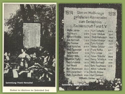 Das Gefallenendenkmal der Forster Fechterschaft – verkippt im stillgelegten Mühlgrabenarm oder abtransportiert? 01.08.2016 21:00 - Frank Henschel ![]() Dabei kam auch die 1910 gebildete Kanusektion der Forster Fechterschaft als erster Kanuverein mit in den Fokus. Ursprünglich wurde der Verein 1898 tatsächlich als Fechtverein zur Übung mit alten deutschen Waffen wie Florett, Säbel und Schläger sowie für Hieb- und Stoßfechten nach Lion’scher Schule gegründet. Ab 1910 konnte der Verein ein Bootshaus am Mühlgraben sein Eigen nennen. An diesem Bootshaus errichtete man u.a. auch ein Denkmal für 31 Vereinsmitglieder, die ihr Leben im 1. Weltkrieg gelassen haben. Der Verein beschreibt es in einer Festschrift selbst als „prächtiges Ehrenmal“. Weiter heißt es: „Auf zwei gewaltigen Granitblöcken stehen die 31 Namen verewigt.“ Doch von dem Denkmal fehlt heute jede Spur. Mitte bis Ende der sechziger Jahre (1965-1969) kam es im Rahmen der Forster Elt-Werkserweiterung zu einer bedeutenden Verlegung des Mühlgrabens. (siehe Bild 2). Das Bootshaus der Fechterschaft hatte damit den direkten Zugang zum Mühlgraben verloren. Inwieweit der Verein nach dem 2. Weltkrieg überhaupt noch existierte ist noch nicht geklärt. Zum Verbleib des Gefallenendenkmals, von dem nur dieses eine Bild bekannt ist, gibt es mehrere Gerüchte. Zum einen könnte es in den still gelegten Mühlgrabenarm gekippt worden sein. Andere Quellen gaben an, etwas von einem Abtransport per LKW gehört zu haben. Doch wohin? Wer ebenfalls Fotos vom Gefallenendenkmal der Forster Fechterschaft besitzt oder etwas zum Verbleib mitteilen kann, ist gebeten, sich an Dr. Herbert Schulze Wassersport Forst e.V. Tel. 03562-2137 herbertschulze-forst@t-online.de oder an Frank Henschel mobil 0172-3759660 f.henschel@gmx.de zu wenden. |