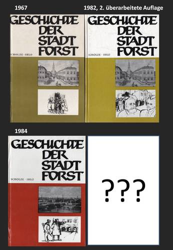 Etwas, das nie erschienen ist oder die unvollendete „Geschichte der Stadt Forst“. 06.08.2017 20:28 - Frank Henschel ![]() Die hauptsächliche Kritik besteht darin, dass das bürgerliche Engagement und Handeln sowie das aus Kreisen der Forster Unternehmer, durchweg diskreditiert wird. Dagegen wird das politische Handeln der Forster Arbeitnehmerschaft völlig überhöht zur Darstellung gebracht. Es sind Bücher, die ein sozialistisches/kommunistisches Geschichtsbild transportieren. Eine sehr wichtige Quelle für den Forster Geschichtsinteressierten kann ihnen aber ohne Frage zugeschrieben werden. In diesen Tagen hat mich der Geschichtsforscher Manfred Geisler auf die Unvollständigkeit der beiden Bücher hingewiesen. Und er hat recht! Der olivgrüne Band erschien 1967 und in einer überarbeiteten 2. Auflage 1982. Es ist der I.Teil der „Geschichte der Stadt Forst/Lausitz“ - Die Stadt von den Anfängen bis zum 1. Weltkrieg. 17 Jahre später, 1984 erschien dann die Fortsetzung im roten Einband. Doch ein genauer Blick auf den Innentitel (hier ganz unten im Bild) zeigt Erstaunliches. Dort heißt es „Geschichte der Stadt Forst/Lausitz“, II. Teil, 1. Hälfte (!) – Die Stadt während der Novemberrevolution 1918 und ihre Entwicklung in der revolutionären Nachkriegszeit bis Ende 1923. Weitere Bücher sind dann nicht mehr erschienen. Aber warum? Zumal vom Teil II ja nur die 1. Hälfte erschienen ist. Obwohl Teil II/1. Hälfte mit rund 350 Seiten schon einen recht großen Umfang hat, wird auch nur einen Zeitabschnitt von lediglich 5 Jahren betrachtet. Beide Autoren sind in der zwischen verstorben und können nicht mehr gefragt werden, inwieweit weitere Bücher zur „Geschichte der Stadt Forst“ geplant waren. Aber vielleicht haben die Leser dieser Seite eine Idee, warum die „Geschichte der Stadt Forst“ von Scholze/Ihlo unvollendet blieb. Frank Henschel f.henschel@gmx.de |