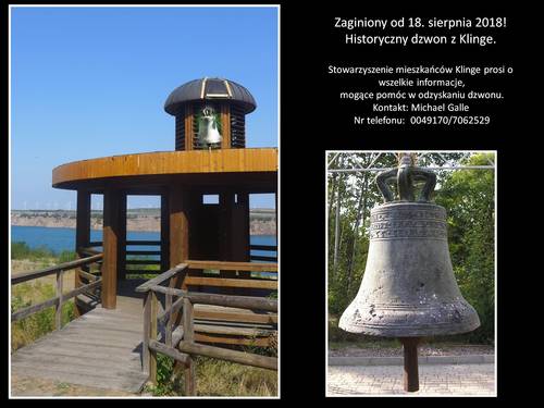 Od 18.sierpnia 2018 nie ma śladu po historycznym dzwonie z Klinge. 06.09.2018 20:00 - Frank Henschel ![]() Olbrzymim nakładem sił po obu stronach Nysy, stowarzyszenie mieszkańców Klinge próbuje odzyskać dzwon. Głęboko wierzymy w to, że zostanie on odnaleziony, a może nawet zwrócony. Wszelkie informacje dotyczące zaginionego dzwonu prosimy zgłaszać do Pana Michaela Galle, pod numerem telefonu 00491707062529. |
