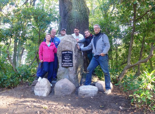 Eine hundert jährige Sänger Geschichte verbarg sich in einem zugewachsener Steinhaufen 25.09.2018 20:30 - Frank Henschel ![]() 2016 begaben sich die Besucher des Forster Geschichtsstammtisches auf Spurensuche in den alten Forster Stadtpark. Doch der Glanz vergangener Zeiten ist verblasst. Nur noch mit historischen Postkarten lassen sich die aufwendigen Parkgestaltungen nachvollziehen. Der kleine See mit Wasserfall und Brücke ist verloren. Die große Fontäne ist versiegt. Das Schützenhaus am Rande des Parks ist abgetragen. Dennoch ist die einstige „grüne Lunge“ mit seinem schönen Baumbestand auch heutzutage einen Spaziergang wert. Und so manche alte Forster Geschichte lässt sich immer noch entdecken. Schon bei dem Rundgang vor zwei Jahren reifte der Wunsch, der alten Sänger-Eiche ihre Geschichte zurück zugeben. Die schwarze Marmorplatte ging schon vor langer Zeit verloren und die gesamte Anlage mit dem großen Granitstein verschwandt in einer Rhododendronhecke. Die voran gegangenen Forschungen um die Sänger-Eiche brachten zu Tage, dass dies der wichtigste Identifikationsort des im Jahre 1832 gegründeten Forster Männergesangsvereins war. Die Eiche pflanzten die Sänger 1892 zu ihrem 60. Bestehen. Zehn Jahre später wurde der große Granitstein mit der Widmung aufgestellt. Doch zur Vereinsgeschichte der Sänger gehören auch vier im 1. Weltkrieg Gefallenen. Auch ihnen wurde mit vier Steinen an der Sängereiche gedacht. Den Abschluss der Anlage bildet ein Stein mit den Jahreszahlen 1832-1932 zum 100 jährigen Jubiläum des Vereins. Vermutlich geriet die Sängereichen-Anlage nach dem 2. Weltkrieg in Vergessenheit. In dieser Woche haben Mitglieder des Museumsvereins und des Geschichtsstammtisches die alte Sängereiche wieder in die Öffentlichkeit geholt. Nach dem Freischnitt durch die Stadt Forst konnte die verloren Tafel ersetzt und Beschriftung der Steine für die gefallenen Sänger erneuert werden. Nicht zu finden war der vierte Gedenkstein für den Gefallenen Richard Hartmann, der noch auf historischen Fotos zu sehen war. Bei der Suche nach ihm fand man im nahe gelegenen Buschwerk einen weiteren Findling mit der verblassten Inschrift: „MARKO-EICHE 5.6.1932“ Die Forster Heimatforscher waren sich schnell einig, dass der neben der Sänger-Eiche stehende Baum Paul M. Marko (1877-1940) gewidmet sein muss. Aufgewachsen in einem Forster Kinderheim ging er nach Amerika. Mit der Entwicklung und Produktion von Autobatterien wurde er in New York sehr reich und eine anerkannte Persönlichkeit. Mit seinem New Yorker Männerchor „Arion“ besuchte er mehrfach Forst und die Forster Sänger. Hier übergab er großzügige Spenden damit Forster Waisenhauskinder in den Urlaub fahren konnten. Nun erinnert neben dem leer stehenden MARKO-Heim in der Virchowstraße auch wieder eine Eiche im Forster Stadtpark an den einstigen Wohltäter. Mehr über Paul M. Marko finden Interessierte im Forster Jahrbuch 2006 oder im Archiv der Lausitzer Rundschau: https://www.lr-online.de/lausitz/forst/uneigennuetzig-half-paul-marko-den-waisenkindern-seiner-geburtsstadt_aid-3258903 Um die Wiederherrichtung der Sänger-Eichen-Anlage mühten sich: Birgit Eichler, Hagen Pusch, Tomasz Niemiec aus Brody, Jörg Pazzig, Frank Owczarek und Frank Henschel. Frank Henschel f.henschel@gmx.de |