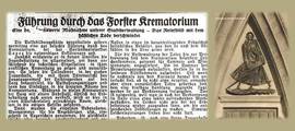 Dies war die Unterüberschrift eines Artikels aus dem Forster Tageblatt vom 13.Oktober 1941. In dem Bericht über eine Führung der Volksbildungsstätte durch das Krematorium wird auch das verschollene Relief „Schnitter Tod“ von dem Dresdener Bildhauer Georg Wrba behandelt. Dazu heißt in dem Artikel: „Am Schluß der Führung die allen Teilnehmern sehr wertvolle Aufschlüsse brachte, teilte Gartenbauinspektor Soyez noch mit, daß die Stadtverwaltung jetzt das Relief des häßlichen Todes, das über